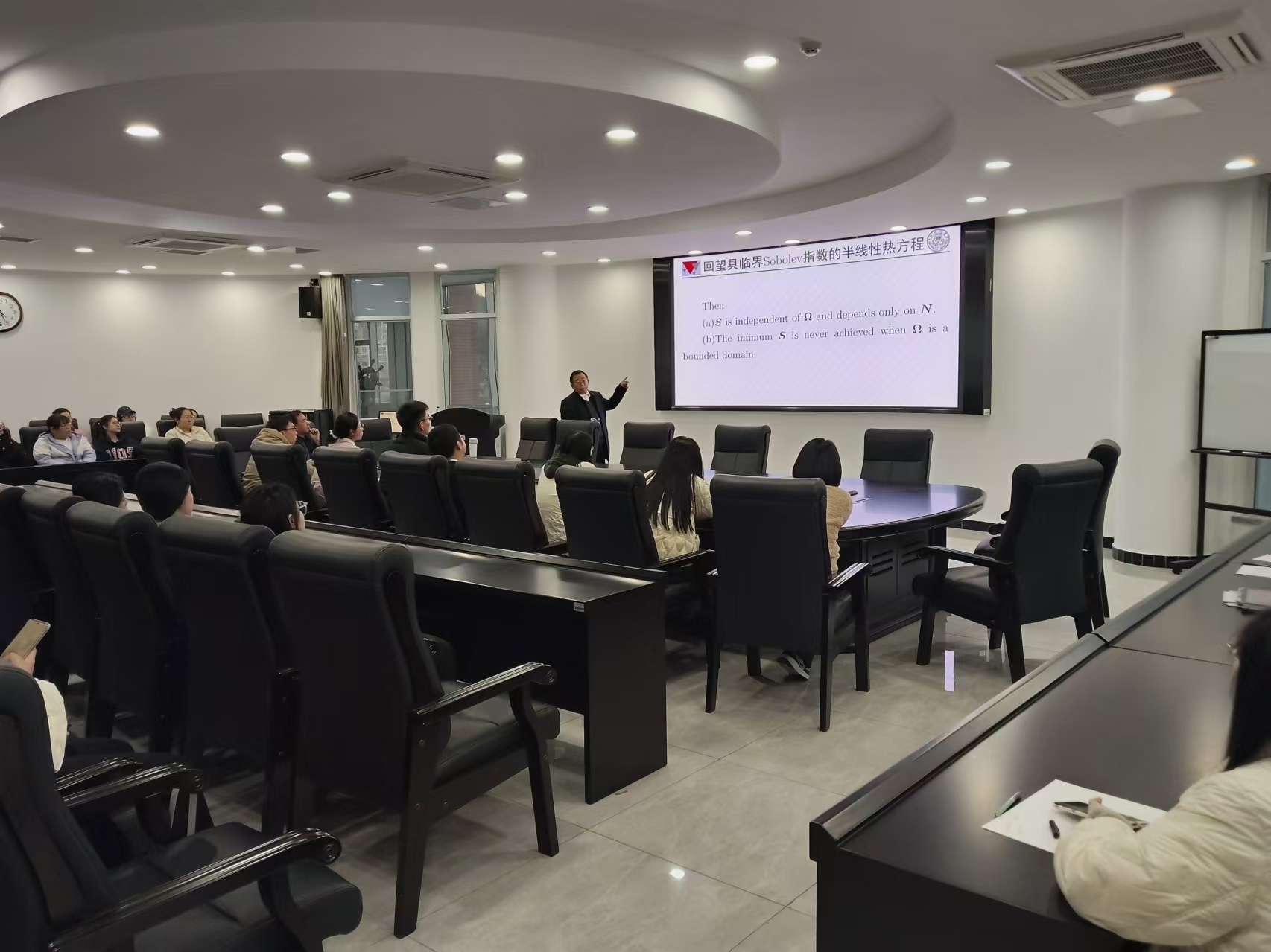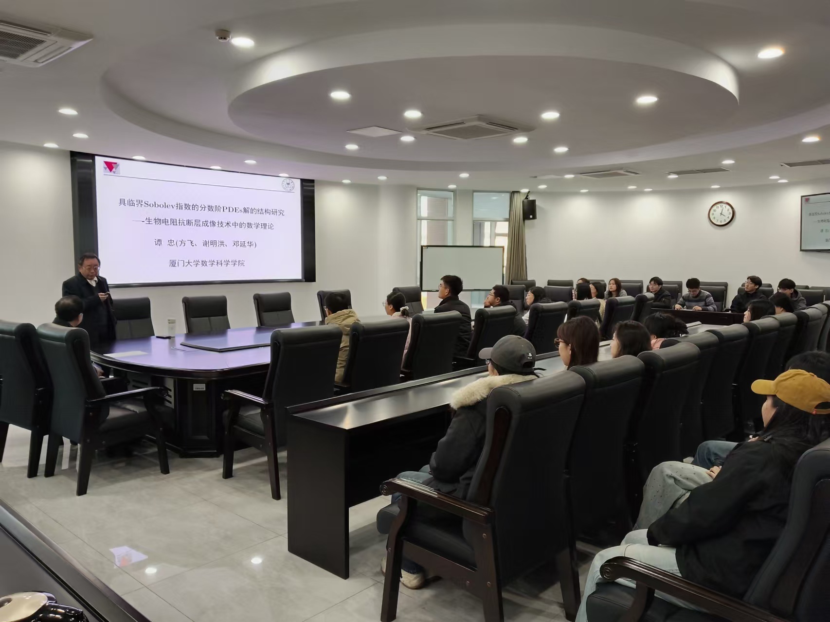会议室作了一场题为《具临界Sobolev增长指数和分数阶拉普拉斯算子的PDEs方程解的结构研究》的精彩学术报告,报告由数学学科带头人韩友发教授主持。